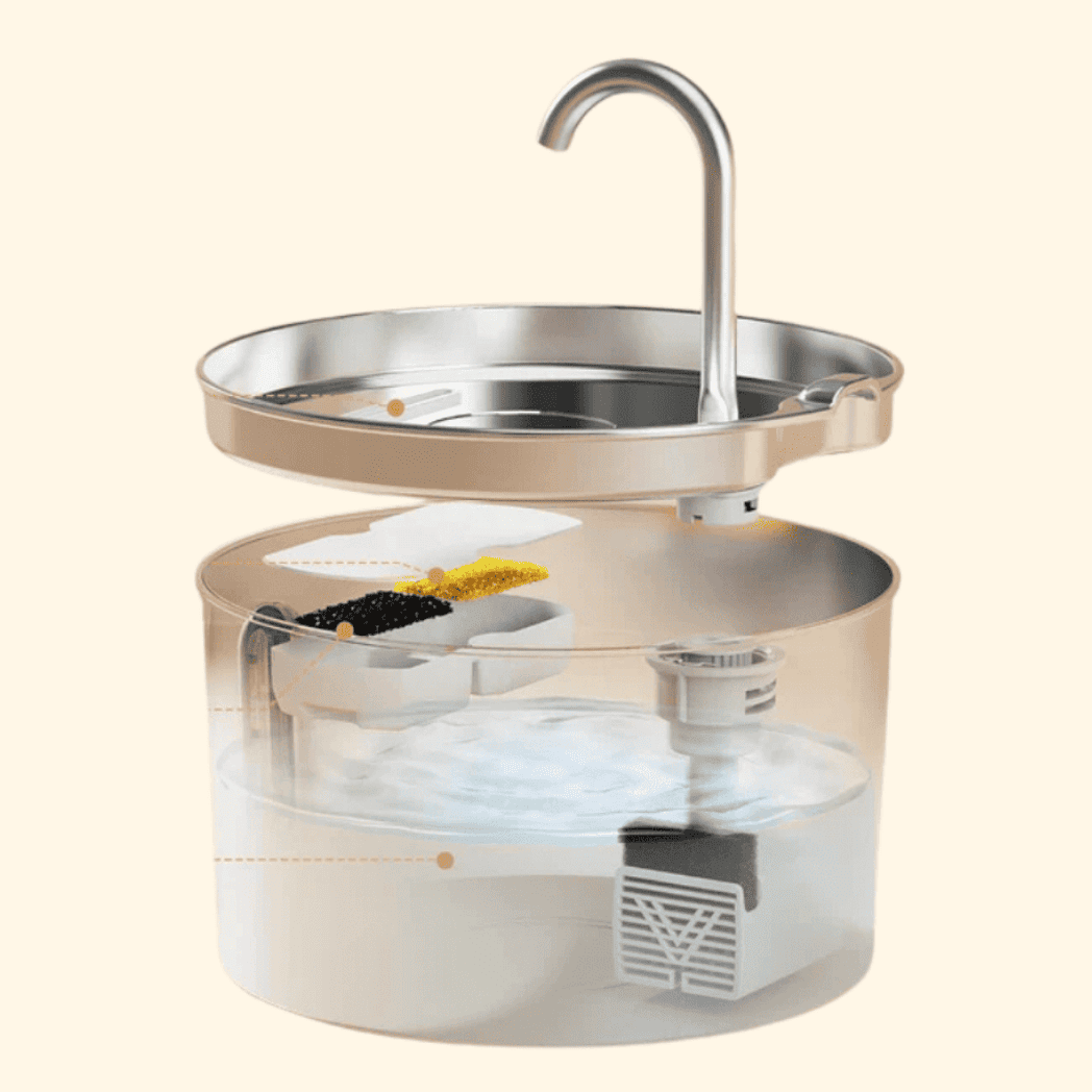 La nostra fontana è dotata di acciaio inossidabile 304 di grado chirurgico e filtrazione a tripla azione per erogare acqua pura, corrente e priva di batteri, alla quale i gatti sono istintivamente attratti – aiuta a prevenire malattie renali, IVU e blocchi urinari prima che inizino.